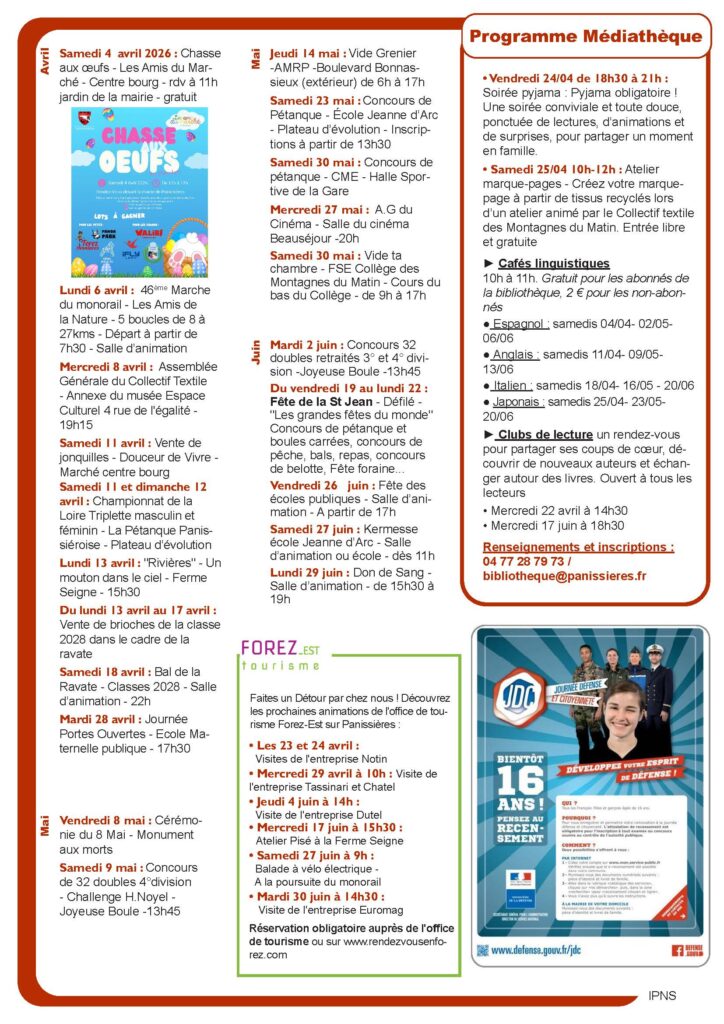 Afin d’informer les Panissièrois, nous avons fait le choix de mettre en place une lettre d’information : le Flash info. Ce support est aujourd’hui trimestriel et a pour but de recenser et communiquer sur les actions effectuées et projets à venir, mais également de fournir un agenda des manifestations sur la commune :